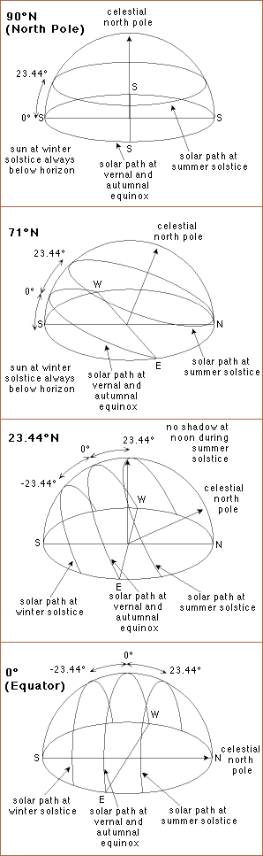 The graphic below shows the apparent movement of the sun at summer solstice, the equinoxes and winter solstice for (from top to bottom) the North Pole, 71°N, 22.44°N and the equator. Scroll through the figures and compare the Sun's paths.