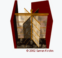 The addition of a smaller set of sails perpendicular to the main sails improved the mill further. The mill top now directed itself against the wind and followed changes in the wind direction automatically. |