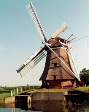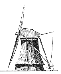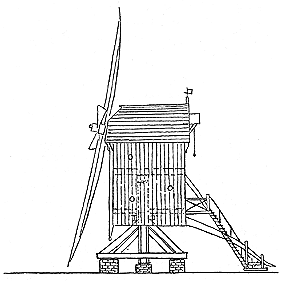 Dutch towermills improved the construction by reducing the part directed against the wind to the top of the mill only. This allowed the major part of the mill to be built in solid construction (such as brick). A lever attached to the top allowed it to be manually directed against the wind. |