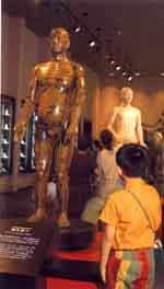 The photo shows acupuncture models on display in the National Museum of Natural Science in Taichung, Taiwan. The bronze figure in the foreground is a copy of the original cast made by Wang Weiji during the Sung Dynasty. 666 acupuncture points are indicated by holes and their names inscribed next to them. During examinations the figure and the names of the points were covered with wax and the model filled with water. The student was then asked to insert a needle in a specific point. Water spilled out if the point was located correctly.