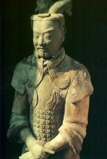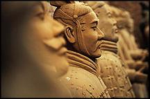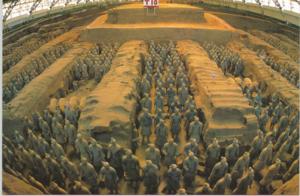 The tomb is believed to be an immense complex. Covered up by Shi huang-ti's successor, it was rediscovered in 1974, when a workers' brigade drilling a well discovered an underground chamber. As it turned out, the chamber contains over 6000 life-size terra-cotta figures of soldiers and horses. Each figure is individually formed, and not two are alike. The figures carry real weapons, ride in chariots and bring along valuable objects of silk, linen and other materials. Some believe that they are portraits of the emperor's army.