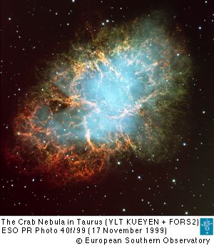 The Crab Nebula, filled with mysterious filaments, is the result of a star that was seen to explode in 1054 AD. This spectacular supernova explosion was recorded by Chinese and (quite probably) Anasazi astronomers of North America. The filaments are mysterious because they appear to have less mass than expelled in the original supernova and higher speed than expected from a free explosion. In the picture below, taken from a Very Large Telescope, the colour indicates what is happening to the electrons in different parts of the Crab Nebula. Red indicates the electrons are recombining with protons to form neutral hydrogen, while blue indicates the electrons are whirling around the magnetic field of the inner nebula. In the nebula's very centre lies a pulsar: a neutron star rotating, in this case, 30 times a second. (NASA, 2003)