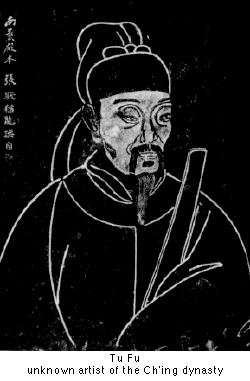 Tu Fu was the son of a familiy of scholars. He received the classical Confucian education, but when he sat for the imperial examinations in 736, he did not pass. He spent the following years travelling, meeting the poets of the time and writing poetry of his own. For a while, he travelled with the poet Li Po, who awakened his interest in Taoism; but after returning to the capital Hsiang-yang (in today's Honan province) Tu Fu turned away from Taoism and returned to classical Confucianism.