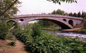 The Zhaozhou bridge in Zhaoxian, Hebei province, is an example of early Chinese road building. It is 9.8 m wide, 50.8 m long and has a span across the Jiao River of 37.4 m.