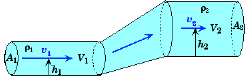 The same principle operates in the second diagram. During any given time interval the same volume has to pass through the narrow section A1 of the pipe with diameter 2h1 as through the wide section A2 (V1 = V2). Therefore the velocity v1 is larger than the velocity v2, and the pressure in the narrow part is smaller than in the wider part.
