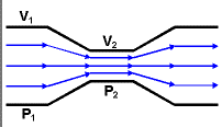 Bernoulli's theorem states that the pressure in a fluid decreases as its velocity increases. In the diagram below the same amount of fluid has to pass through the constriction during any given time as passes through the wider parts of the river, so the fluid velocity v2 in the constriction is larger than the velocity v1 outside it. (This phenomenon is easy to observe in any creek or river.) As a consequence the pressure P2 is smaller than the pressure P1.