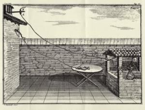The last figure is an illustration of an experiment to investigate the effect of thunderstorms on muscle contraction. Galvani described his observations thus:
