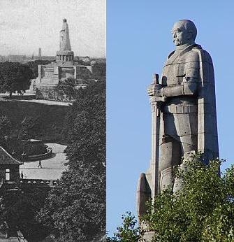 The Bismarck Memorial in Hamburg, Germany. It was built in 1906 and financed by public subscription. The 43.3m tall memorial was the winning entry of a design competition which received over 200 entries. Left: the memorial in 1908; right: the statue on top of the memorial today.