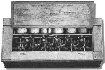 A 6-digit Pascaline opened, showing the sequence of wheels, each carrying ten teeth. In the Conservatoire des Arts et Métiers, Paris, from http://www.thocp.net/hardware/pascaline.htm (accessed 29 August 2004).